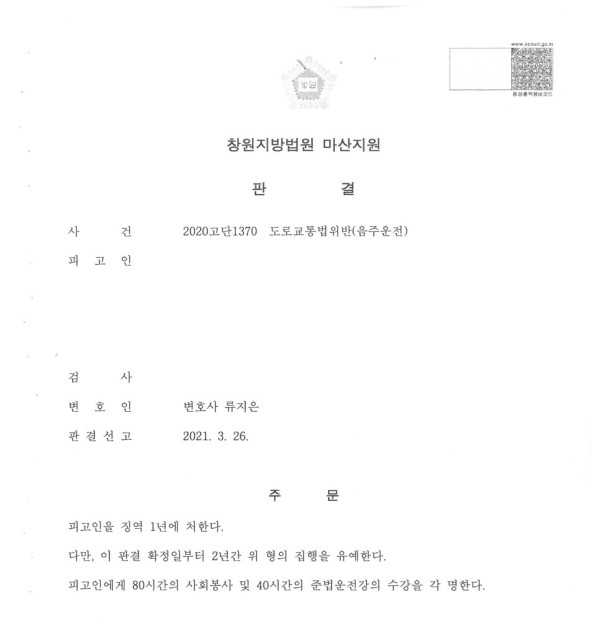 창원지방법원 마산지원 2020고단1370 도로교통법위반(음주운전)