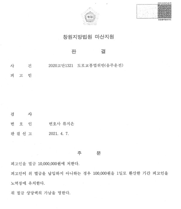 창원지방법원 2020고단1321 도로교통법위반(음주운전)