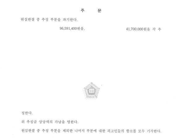 결과적으로 원심 선고 추징액 125,002,000원에서 약 3,000만원 정도 감액된 96,591,400원을 추징하라는 판결이 선고되었습니다.
