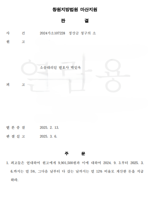 (창원지방법원 마산지원 2024가소107228 정산금 청구의 소)