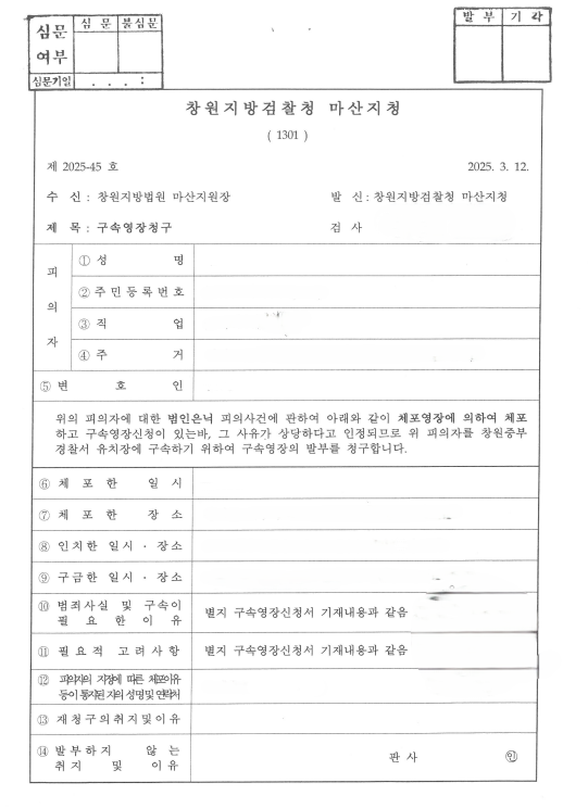 1.사안 창원지방법원 마산지원 구속영장청구(창원지방검찰청 마산지청 2025-45호)