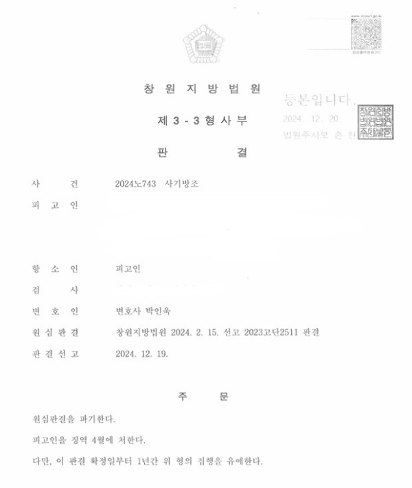 창원지방법원 2024노743 사기방조