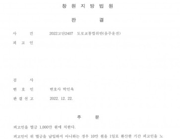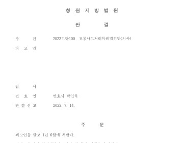 1. 사안 창원지방법원 2022고단1829 도로교통법위반(음주운전) 피고인은 동종전과 1회 있는 자로 술에 취한 상태(0.247%)로 운전을 하였다는 …