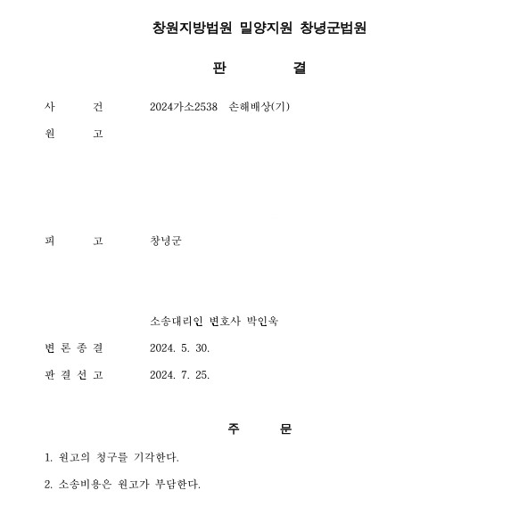 항소심 창원지방법원 밀양지원 창녕군법원 2024가소2538 손해배상(기)