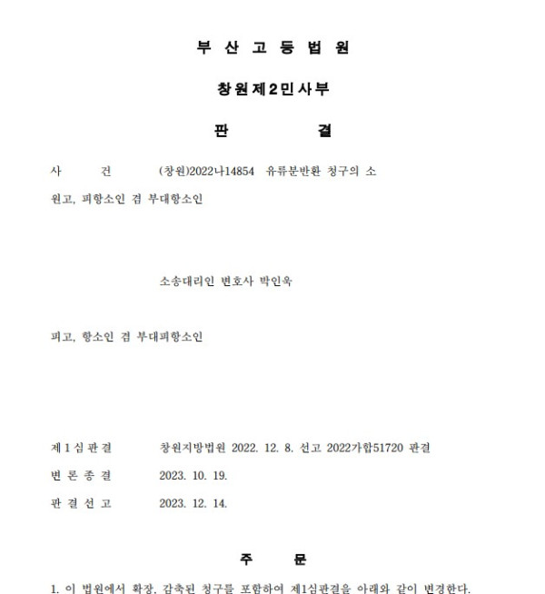 부산고등법원 창원재판부 2022나14854(원심 창원지방법원 2022가합51720 유류분반환청구의 소)