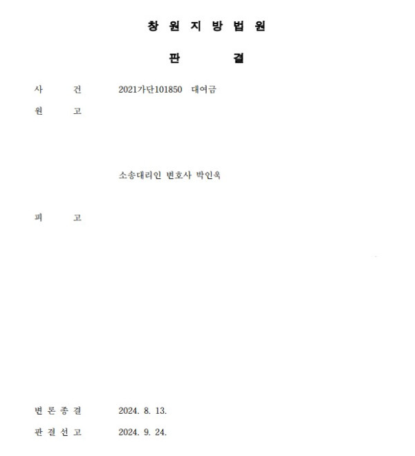 창원지방법원 2021가단101850 대여금
