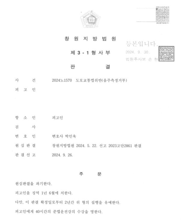 창원지방법원 2024노1570 도로교통법위반(음주측정거부)
