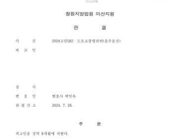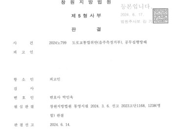 1. 사건의 내용 창원지법 마산지원 2024고단582 도로교통법위반 음주운전 피고인은 과거 10년 내 음주운전 전력이 있는자로 다시 음주운전을 하여(혈중…