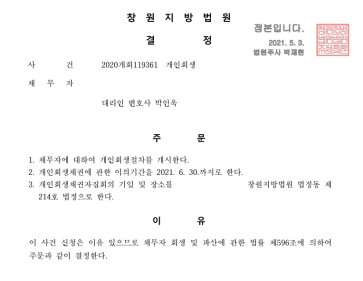 1. 채무자의 총 부채 377,941,862원 2. 월 변제금 1,306,026원을 36개월 동안 변제하는 계획 3. 개시결정 후 원금의 2…
