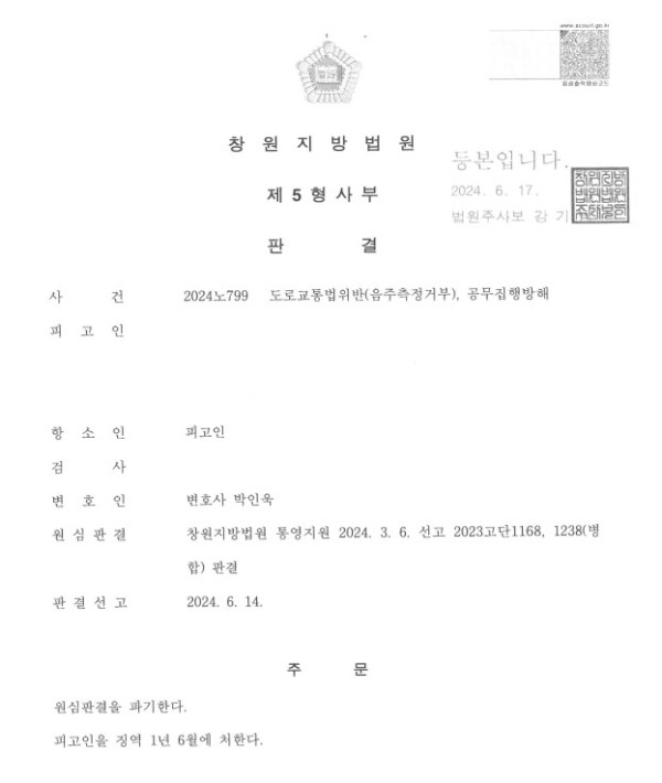 피고인은 1심에서 공무집행방해, 도로교통법위반(음주측정거부)죄로 징역 2년의 실형을 선고받고 항소하였습니다(항소심에서 박인욱 변호사 선임).