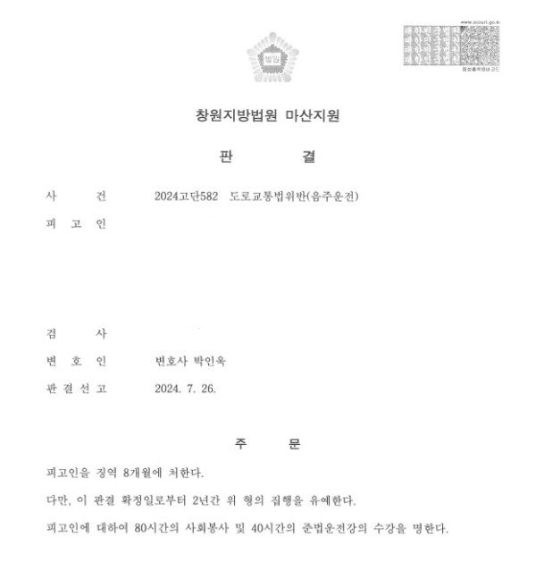 창원지법 마산지원 2024고단582 도로교통법위반 음주운전