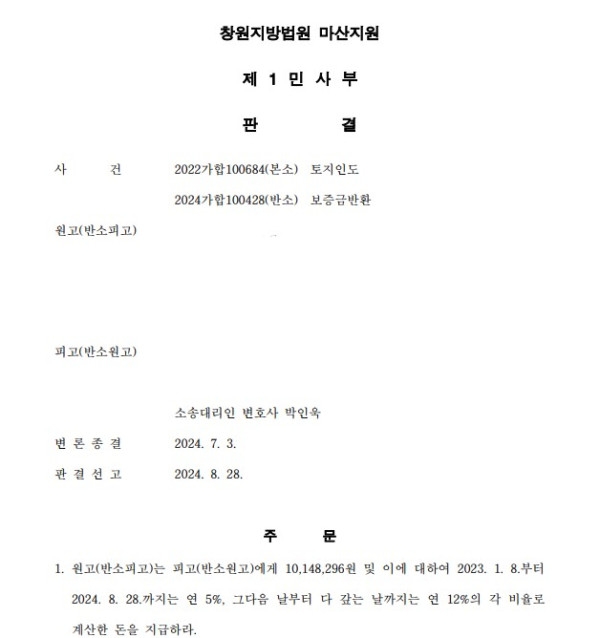 창원지방법원 마산지원 2022가합100684(본소) 토지인도, 2024가합100428(반소) 보증금반환