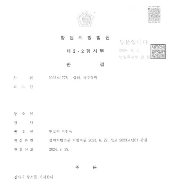 항소심 창원지방법원 2023노1775(원심) 창원지방법원 거창지원 2023고단61 상해(인정된 죄명 폭행), 특수협박