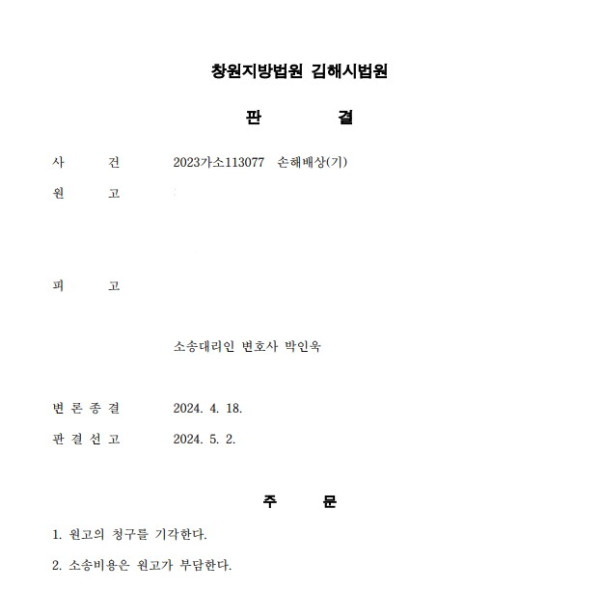 창원지방법원 김해시법원 2023가소113077 손해배상(기)(관련 형사사건 창원지방법원2023고단977 상해)