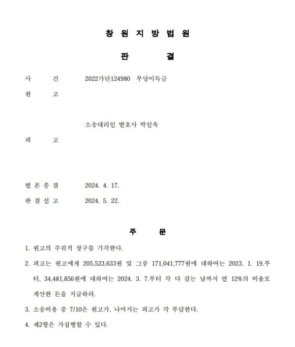 창원지방법원 2022가단124980 부당이득금