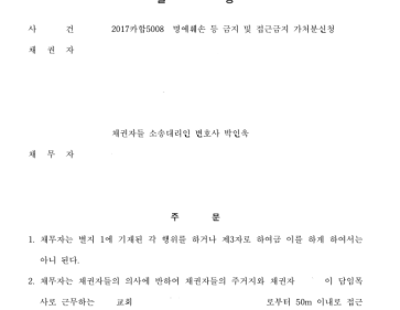 ▣사건번호 2017카합5008 명예훼손 등 금지 및 접근금지 가처분 ▣사안 채권자는 한 교회의 목사이고, 채무자는 교인이었던 자입니다. 채…
