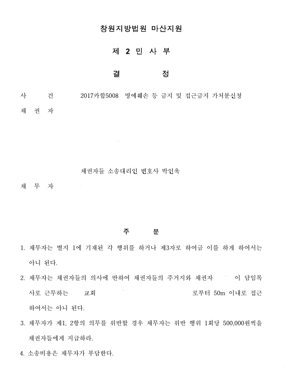 2. 채무자는 채권자들의 의사에 반하여 채권자들의 주거지와 채권자가 근무하는 교회로부터 50m 이내로 접근하여서는 아니 된다.