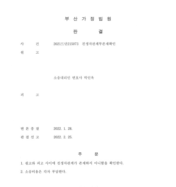 부산가정법원 2021드단215073 친생자관계부존재확인