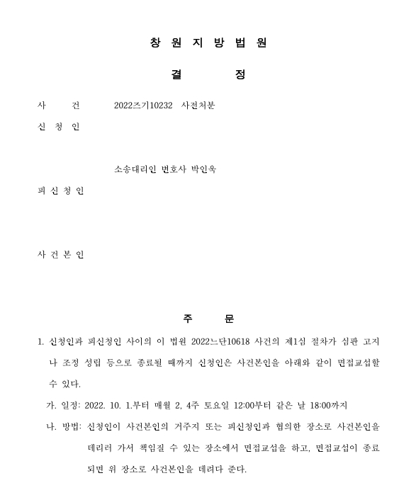 신청인은 본안으로 친권자 및 양육권자 변경심판청구를 하였고, 본안 소송이 종료될 때까지 면접교섭권 확보를 위하여 사전처분신청을 하였습니다.
