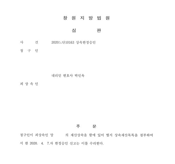 한정승인 신고는 이를 수리한다는 심판결정이 있었습니다.