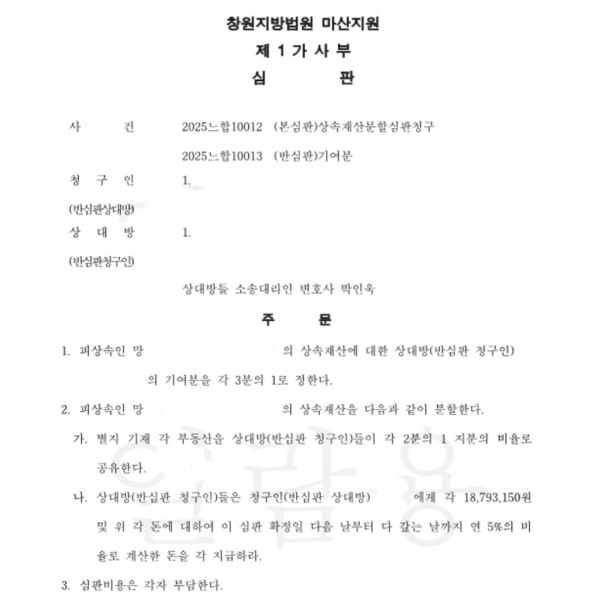 법원은 상대방들의 기여분을 각 3분의 1로 하고, 남아있는 주택 부지 및 주택을 상대방들이 소유하고 일부 금원을 청구인 중 일인에게 지급하는 내용의 판결을 선고하였습니다.
