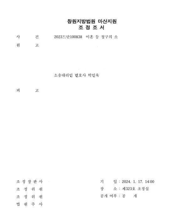 창원지방법원 2023드단100838 이혼 등 청구의 소