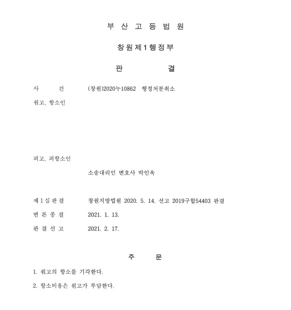 부산고등법원 창원제1행정부 2020누10862 행정처분취소
