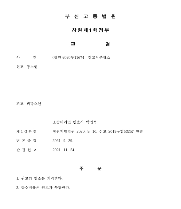 부산고등법원 창원재판부2020누11674 경고처분취소