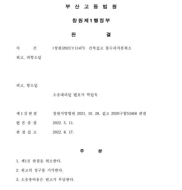 창원지방법원 2021누11473 건축신고 신청 불수리 처분 취소