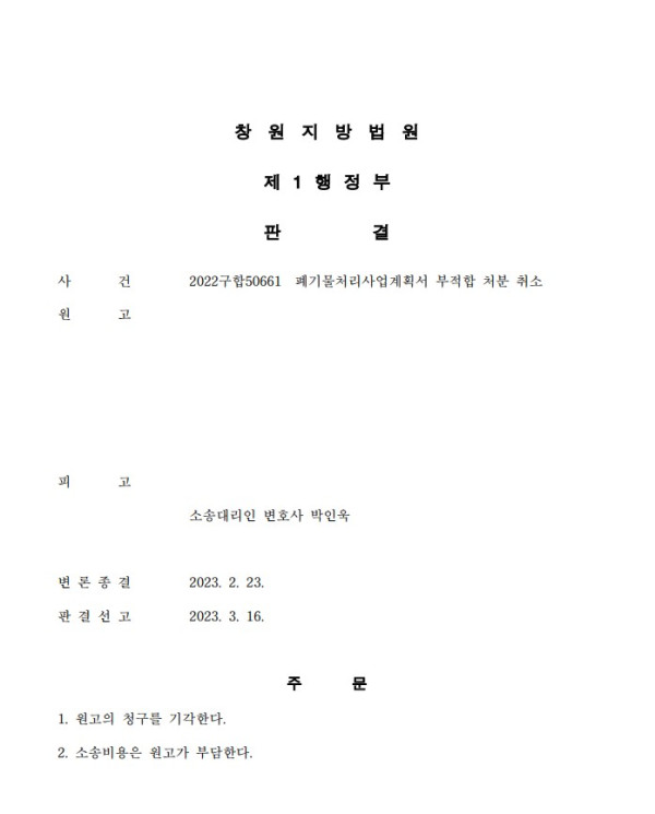 창원지방법원 2022구합50661 폐기물처리사업계획서 부적합 처분 취소