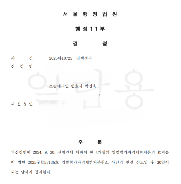 재판부는 신청인의 주장이 이유있다고 받아들여 집행정지 신청에 대한 인용결정을 하였습니다.