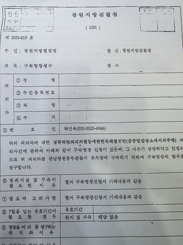 창원지방법원 구속영장청구(창원지방검찰청 2025-819)