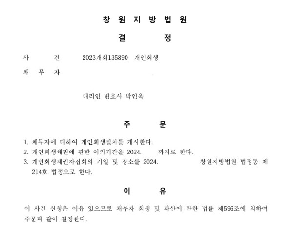 3. 그리하여 총 채무 원금의 30%인 50,580,000원을 변제하는 회생절차 개시결정을 받았습니다.