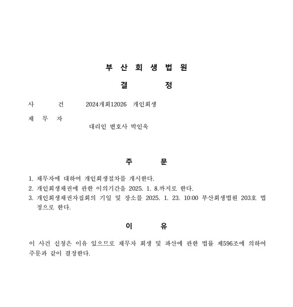 3. 개시결정 후 원금의 31%를 변제하는 회생절차 개시결정을 받았습니다.