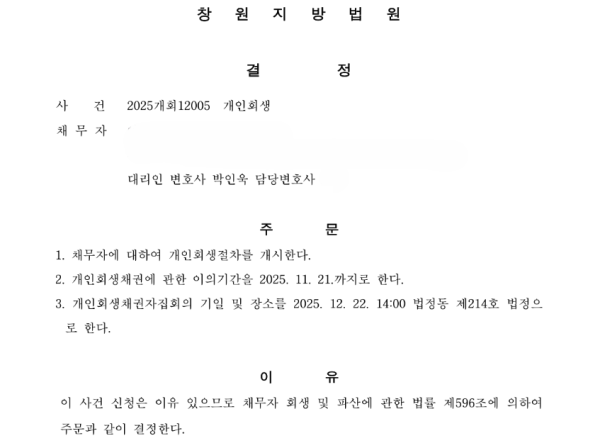 3. 개시결정 후 원금의 22%를 변제하는 회생절차 개시결정을 받았습니다.
