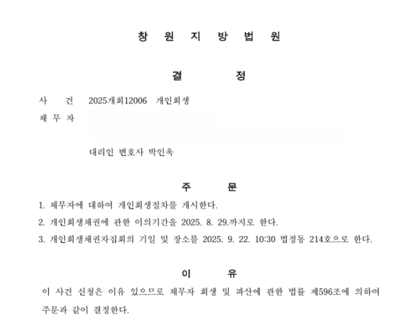 3. 개시결정 후 원금의 23%를 변제하는 회생절차 개시결정을 받았습니다.