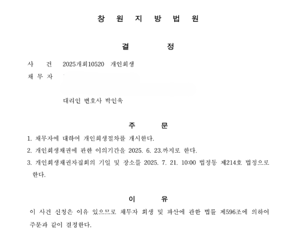 3. 개시결정 후 원금의 22%를 변제하는 회생절차 개시결정을 받았습니다.