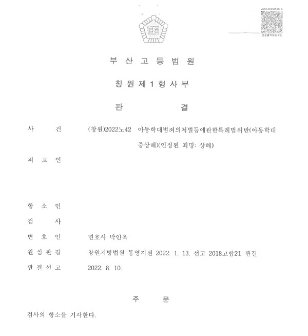 아동학대중상해 무죄, 인정된 죄명 아동학대상해 항소심 검찰 항소기각