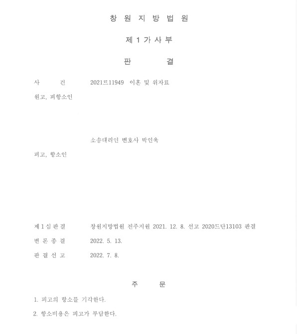 창원지방법원 2021르11949 이혼 및 위자료(원고 대리)